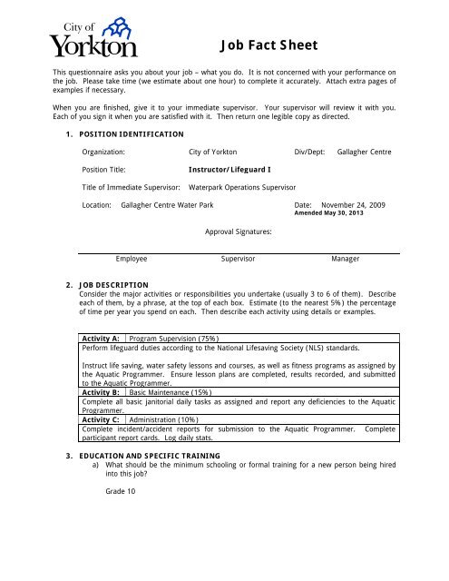 Job Fact Sheet Instructor Lifeguard I Amp Ii Combined City Of Yorkton