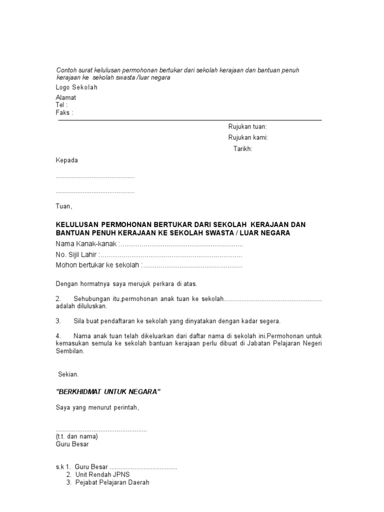 Contoh Surat Kelulusan Tukar Sekolah Swasta Pdf